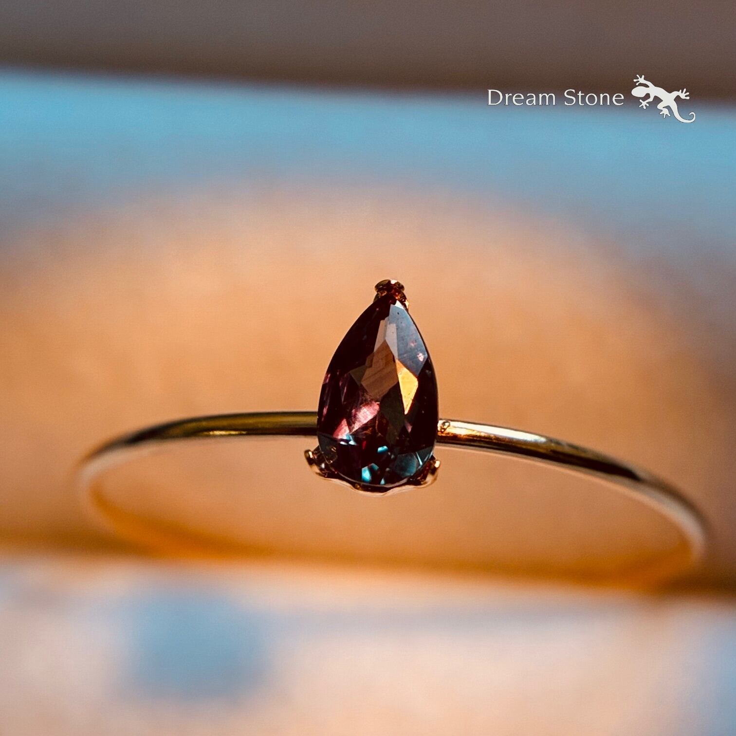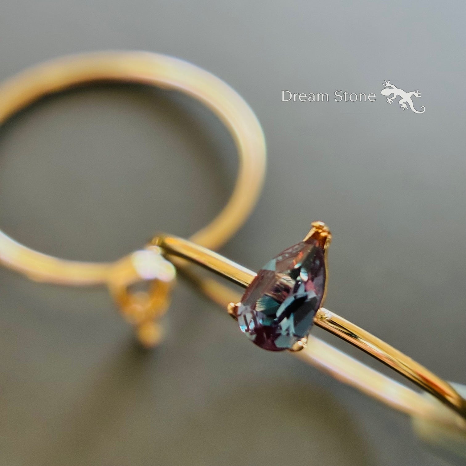幻想的なカラーチェンジを楽しめる高品質な合成石。フォレストグリーンの濃緑色から、燃えるような赤紫色へと変貌するラボグロウン・アレキサンドライト。光源で色の変化が起こる姿はとても興味深く、濃緑色から青緑色、赤紫色から深紅色へと変貌し、様々な表情を魅せてくれます。時折ちらっと見え隠れする群青色も、ラボグロウン・アレキサンドライトならではの魅力のひとつですね。物静かな佇まいの中に、芯の強さや燃えるような闘志を感じさせる宝石です。(石代は別途料金が発生します。オプションで選択可。)