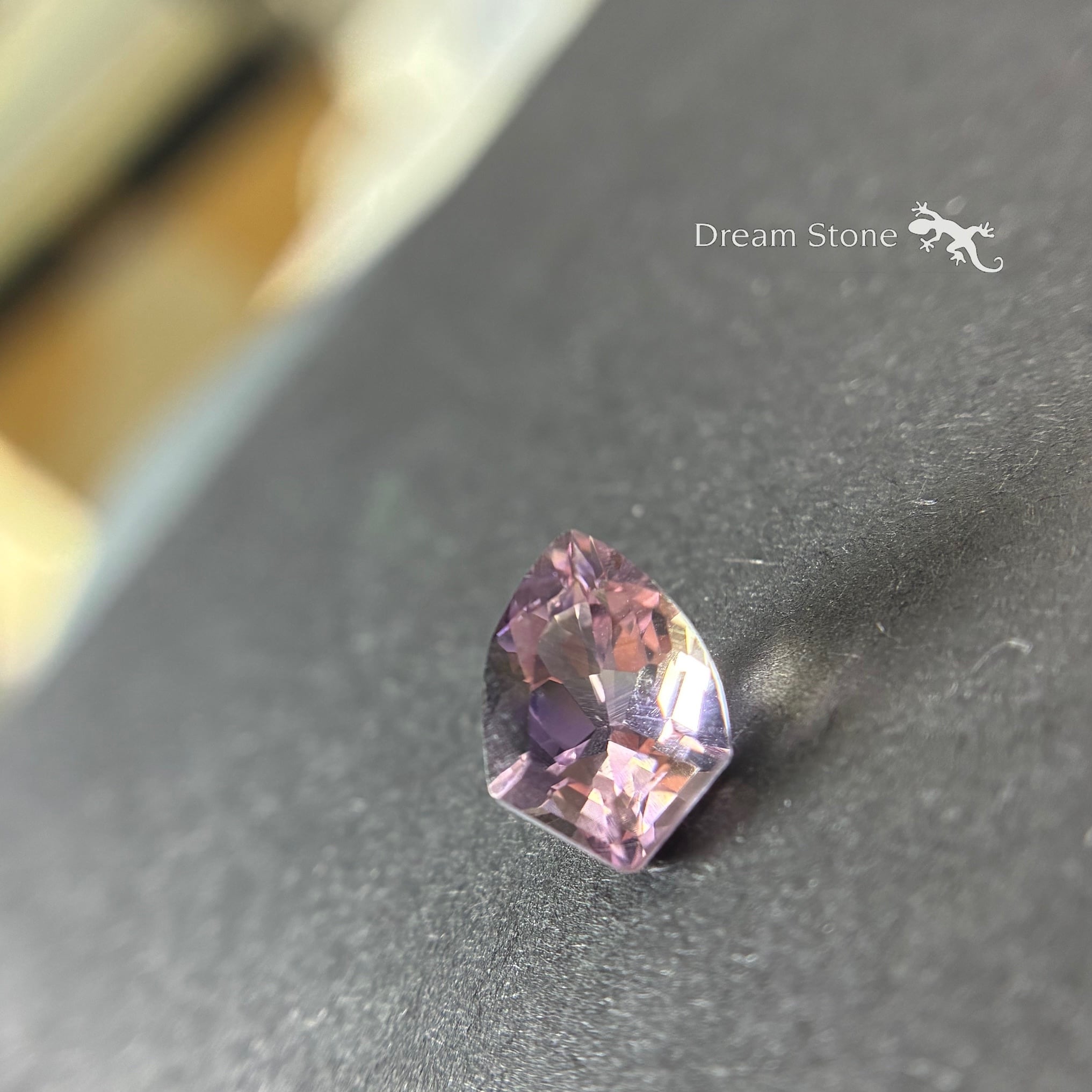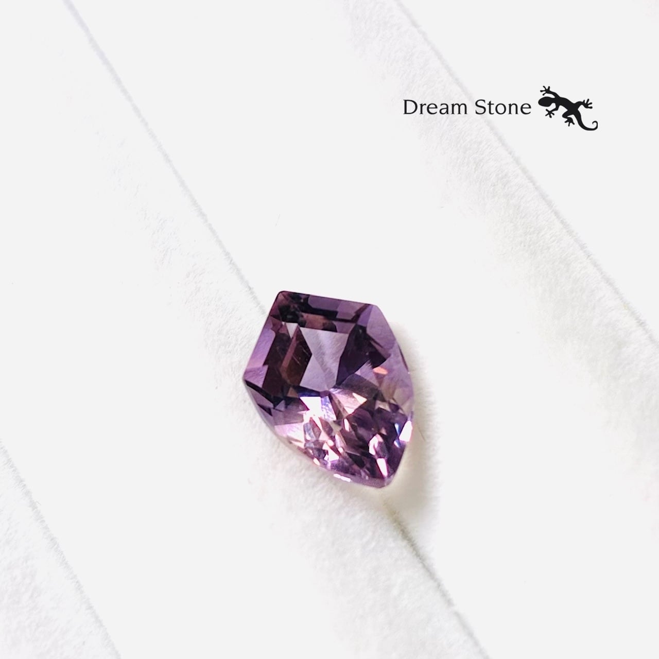ほんのりとした色合いの紫と金が混ざり合い、まるで秋の焼き芋を想わせる、優しい色合いのアメトリン。カットは『シールド(盾)』をイメージしたファンシーカット。アメジストの淡紫とシトリンの淡黄が、ゆらゆらと動かすと蜜のような淡く甘い色合いのグラデーションを生み出しています。