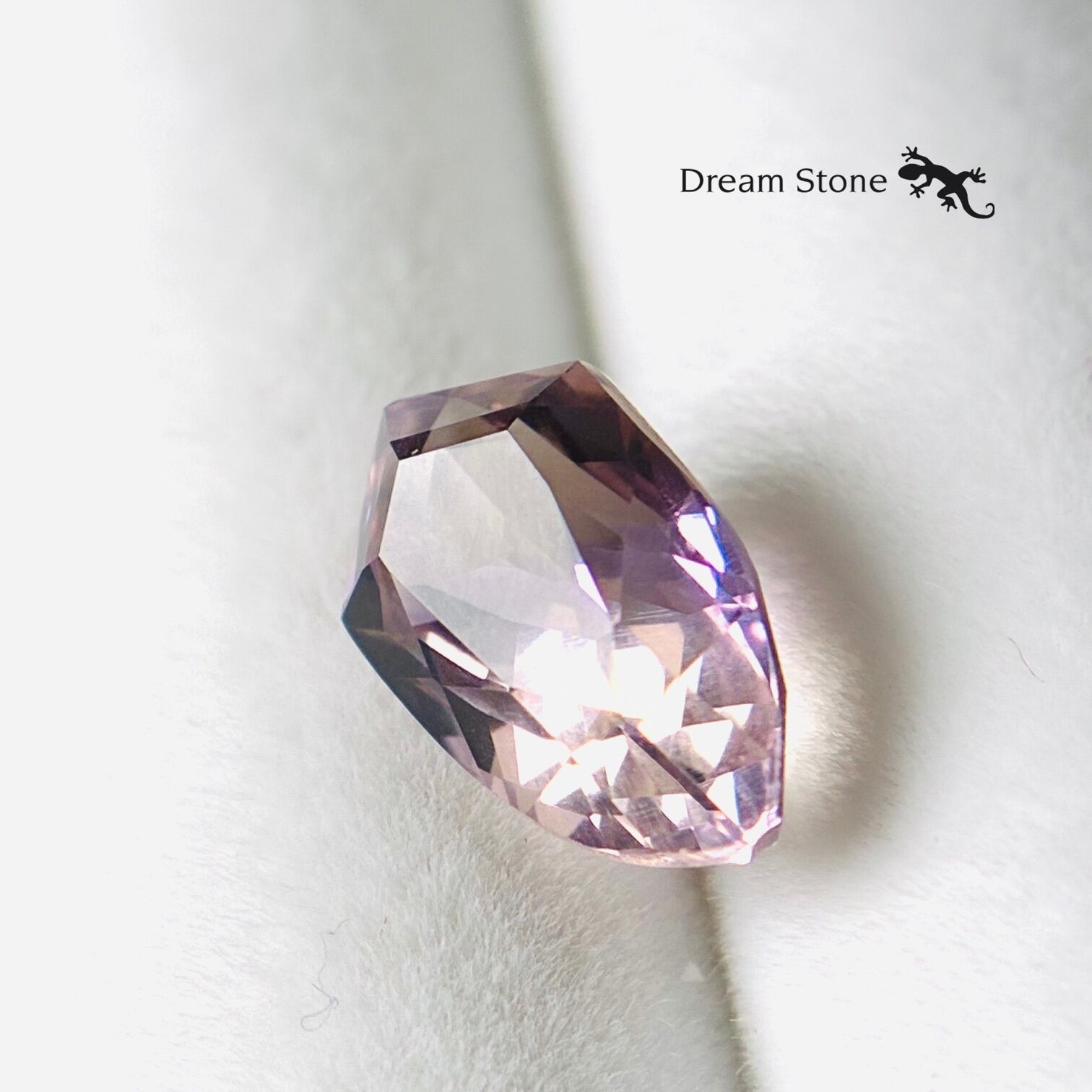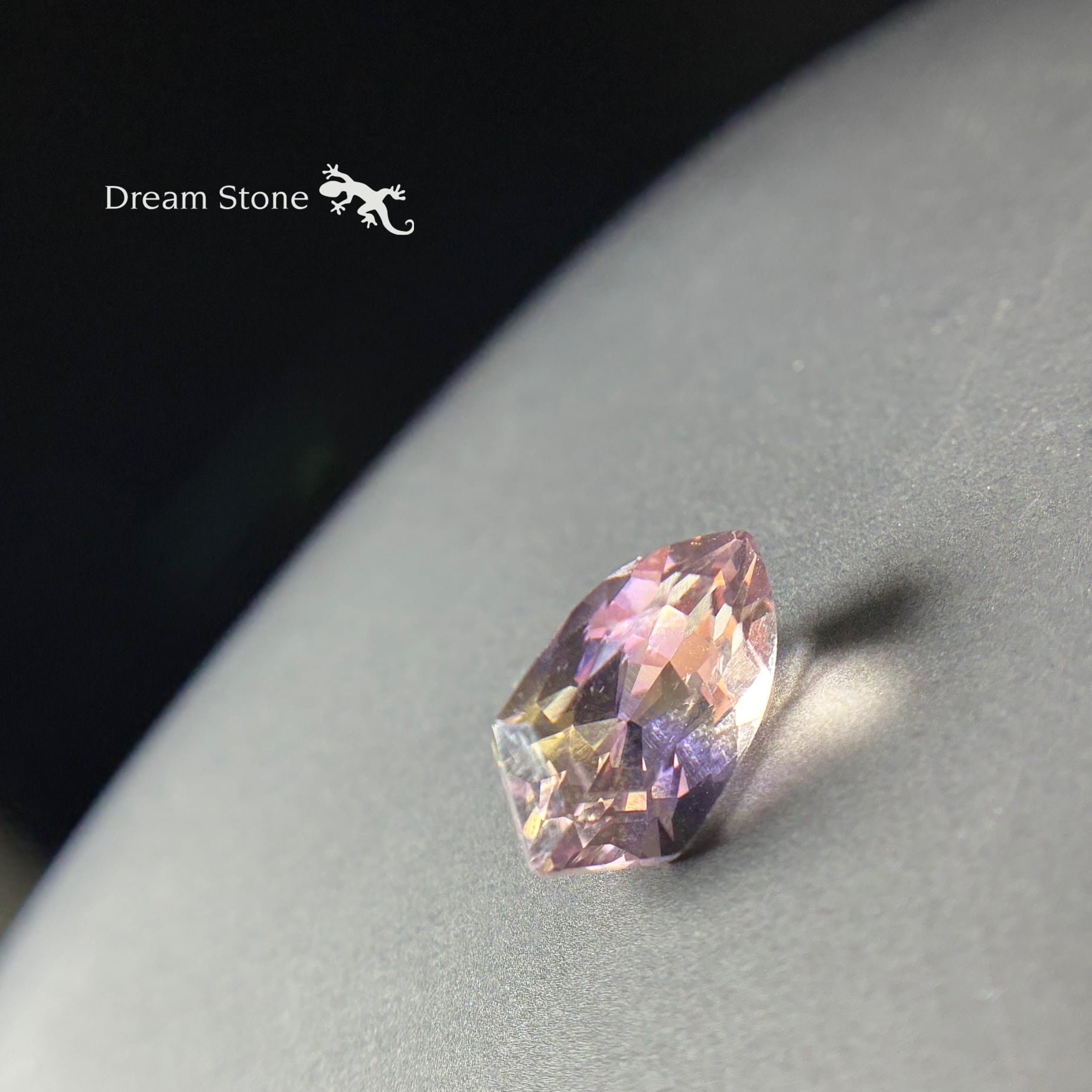 ほんのりとした色合いの紫と金が混ざり合い、まるで秋の焼き芋を想わせる、優しい色合いのアメトリン。カットは『シールド(盾)』をイメージしたファンシーカット。アメジストの淡紫とシトリンの淡黄が、ゆらゆらと動かすと蜜のような淡く甘い色合いのグラデーションを生み出しています。