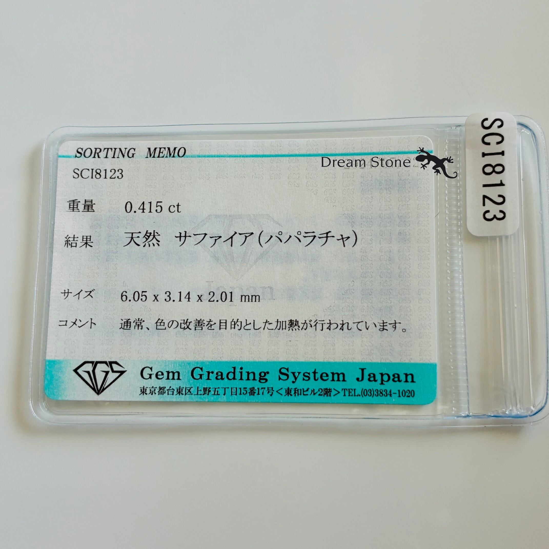 【パパラチアサファイア 0.415ct / ソーティング付 SCI8123】