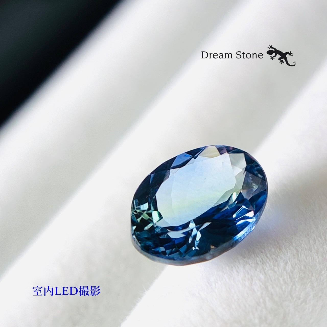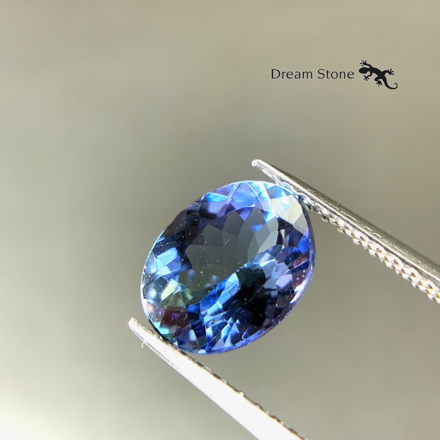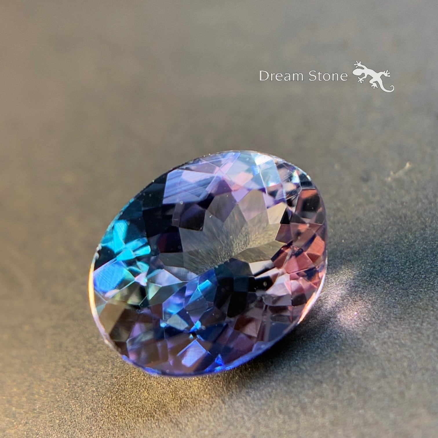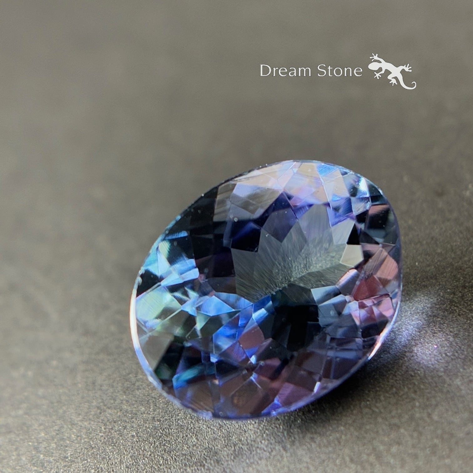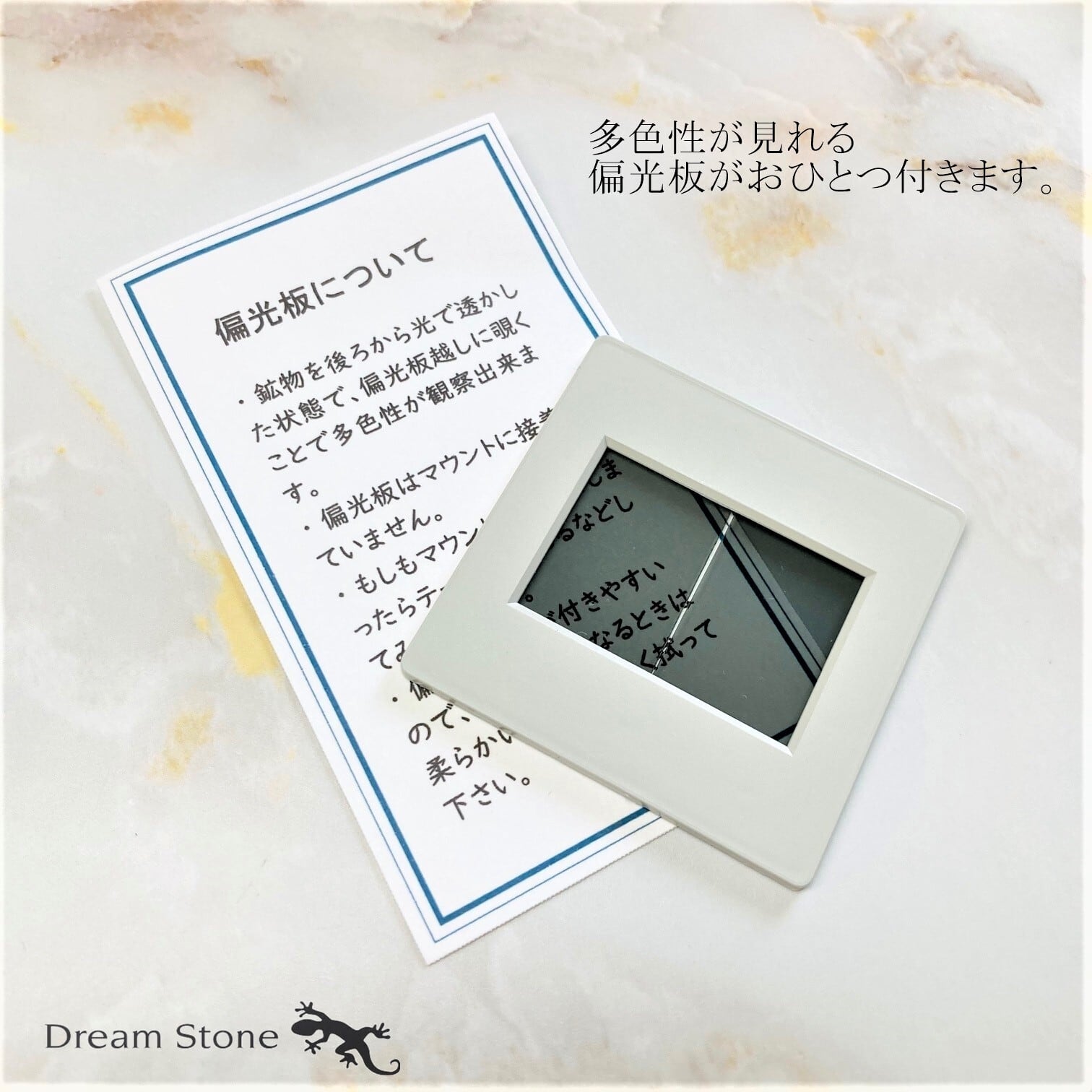 タンザナイトは見る角度や光源の種類によって青、紫、赤みがかった色など、複数の色を見せる多色性(プレオクロイズム)を持つ石です。この幻想的な色の変化が、他の石にはない魅力のひとつですね。この色の変化を楽しむアイテムとして、偏光板がおひとつ付きます。